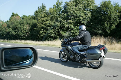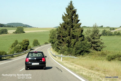 我们用了1小时的时间,大约在9点05分抵达了纽伯格。这里的路,已经很像北环的感觉——单向双车道,两边有铁质护栏,蜿蜒曲折,高低起伏变化很大,周围是郁郁葱葱的草丛和树木。